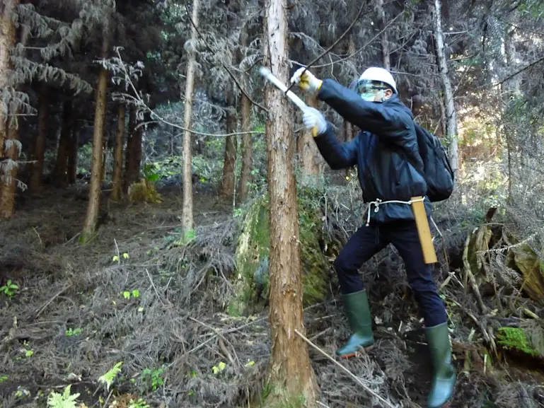 傾斜地での枝打ち作業の様子